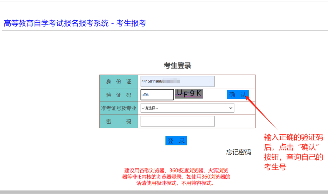 2.输入正确的验证码后,点击“确认”按钮,查询自己的准考证号。