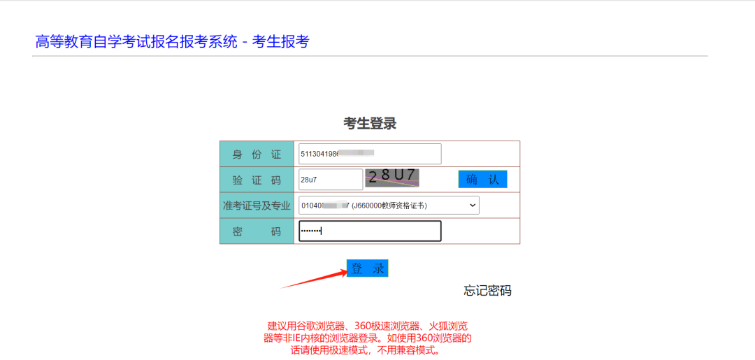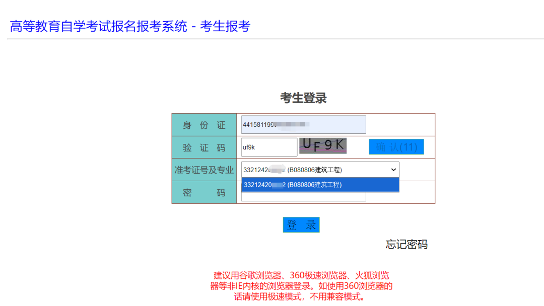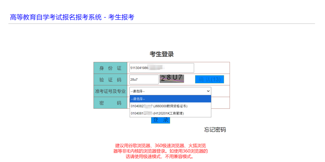 1.选择要报考的准考证后,输入密码,点击“登录”进入系统。新注册考生以自行设置的密码登录,在籍考生登录系统的初始密码为本人有效居民身份证号码后6位(原密码失效)。