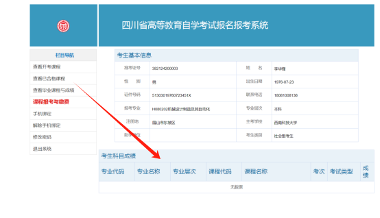 4.查看已合格课程。点击“查看已合格课程”可以查到考生考籍信息及已经取得合格成绩的课程信息。