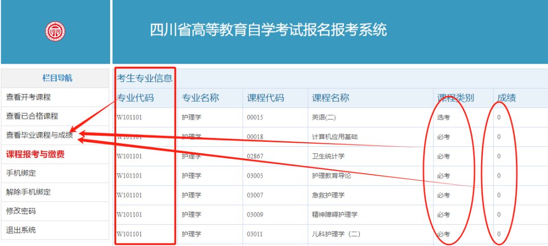 5.查看毕业课程与成绩。点击左边菜单栏“查看毕业课程与成绩”,可以查看本专业下的课程及已获得的成绩。
