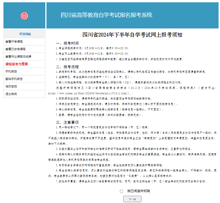 1.点击左边菜单栏“课程报考与缴费”,查看报考须知。