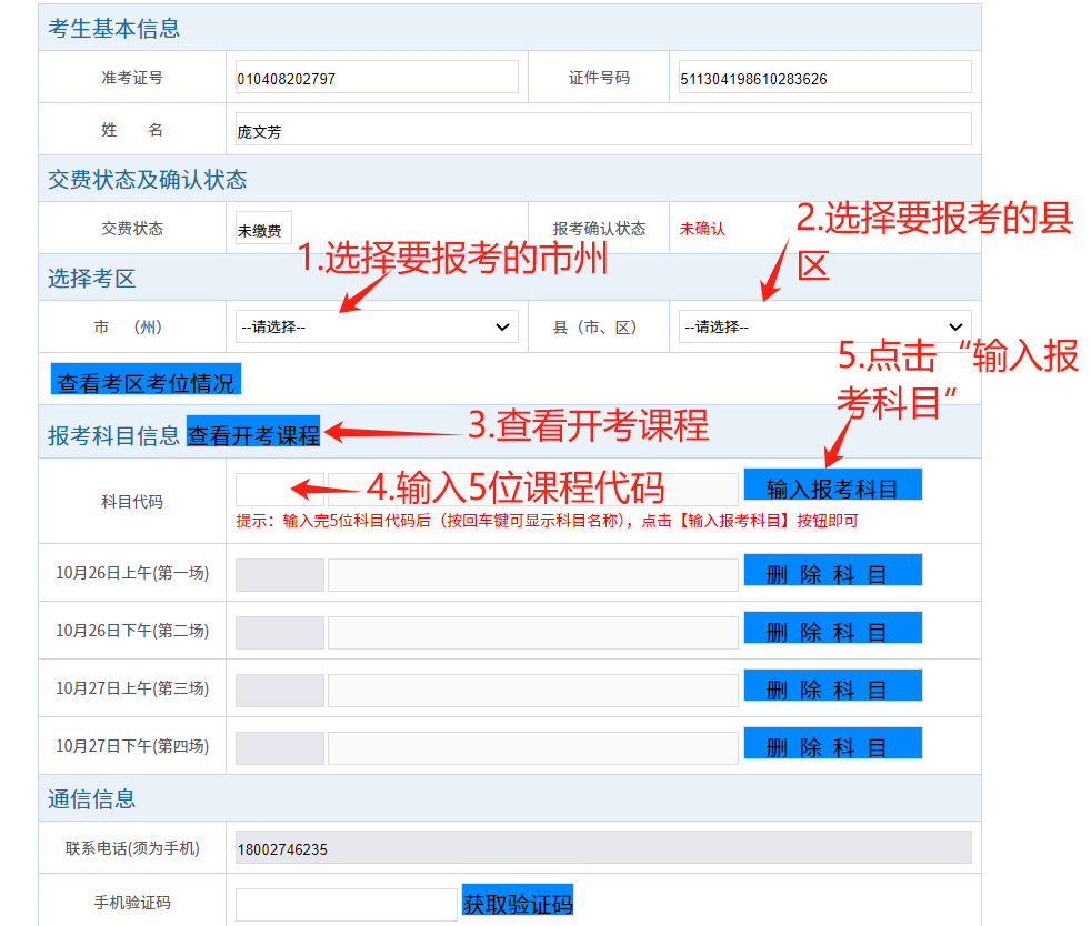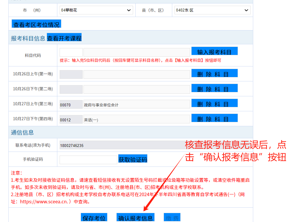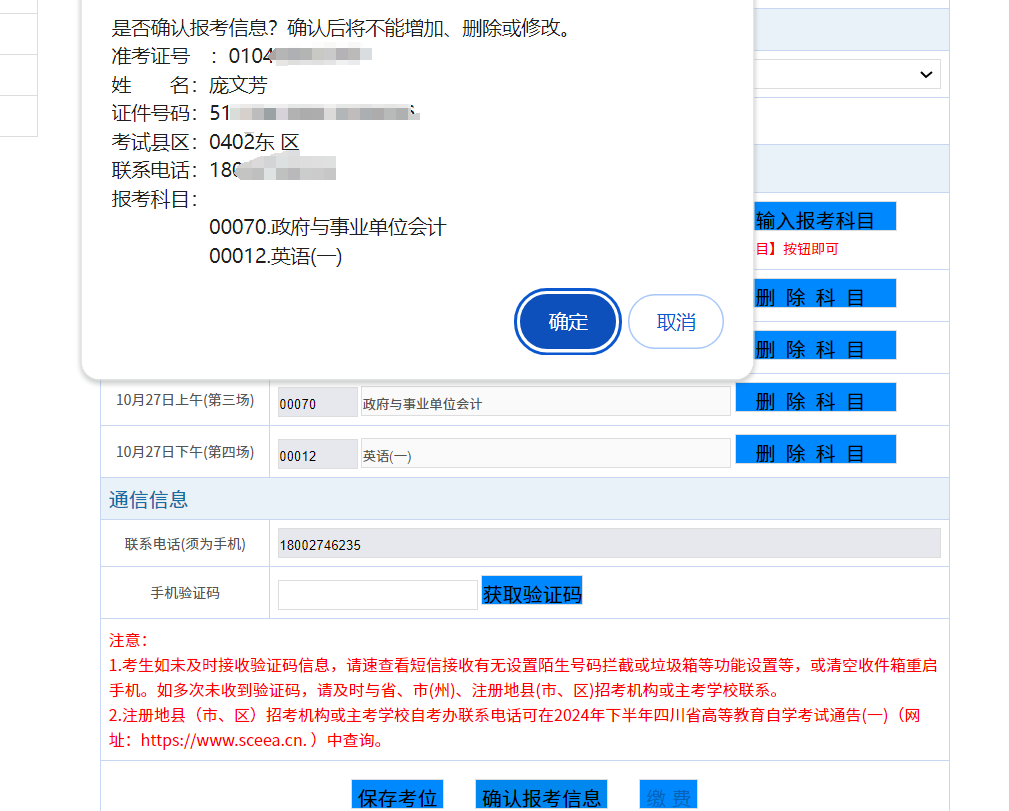 7.“确认报考信息”,课程一经确认,则无法更换考区和更改科目信息。