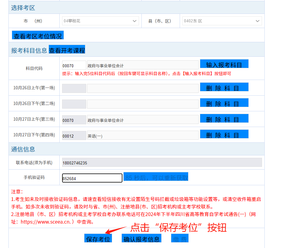 (1)报考信息保存成功后,在已保存的同县(市、区)同考试单元内,可更换课程:删除原保存的报考课程,输入同考试单元其他课程代码,发送验证码并填写,点击“保存考位”,即保存新的报考课程考位,此操作只用于替换已保存考位的报考课程。