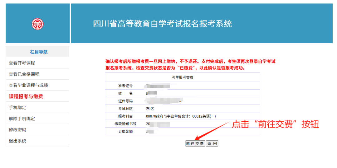 1.核对订单信息。无误后点击“前往交费”按钮。
