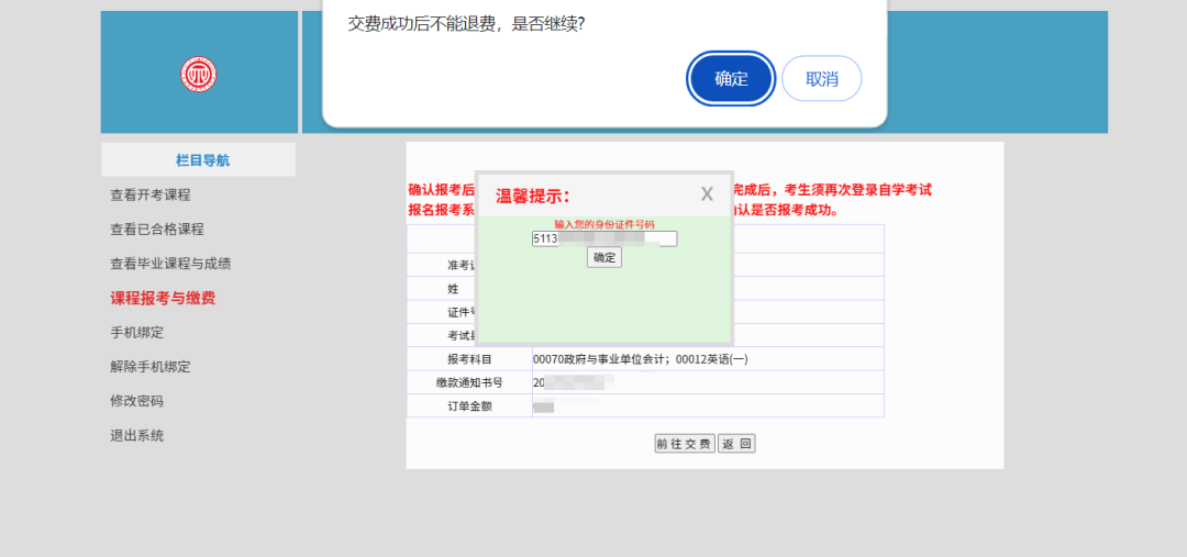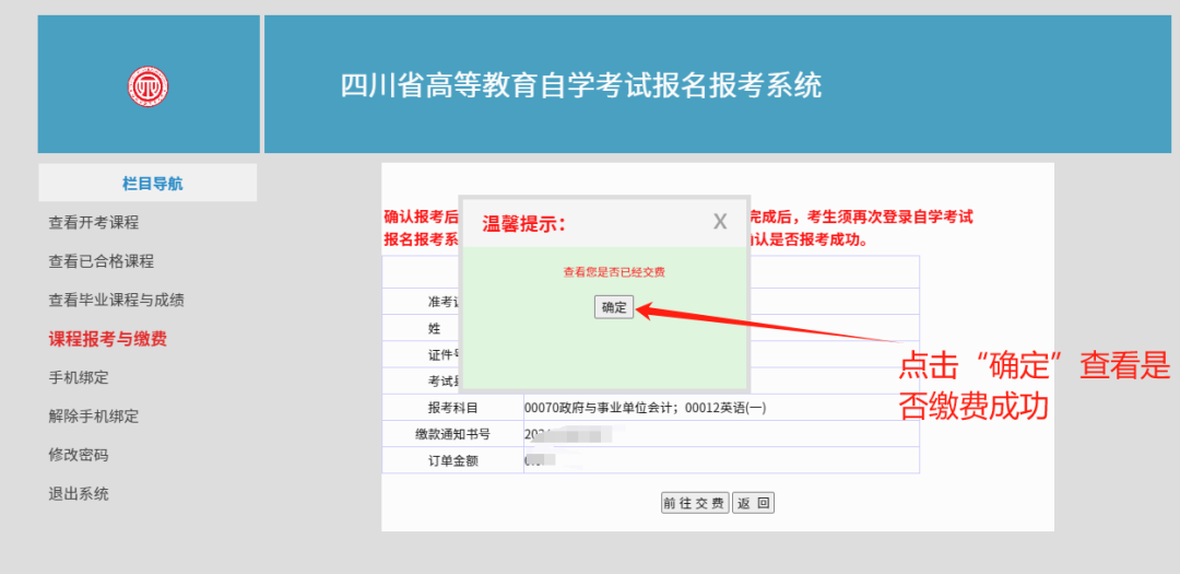 3.考生须再次确认是否前往交费,点击“确定”。系统弹出支付页面(若无弹出,请检查是否浏览器对弹出式窗口做了拦截)。