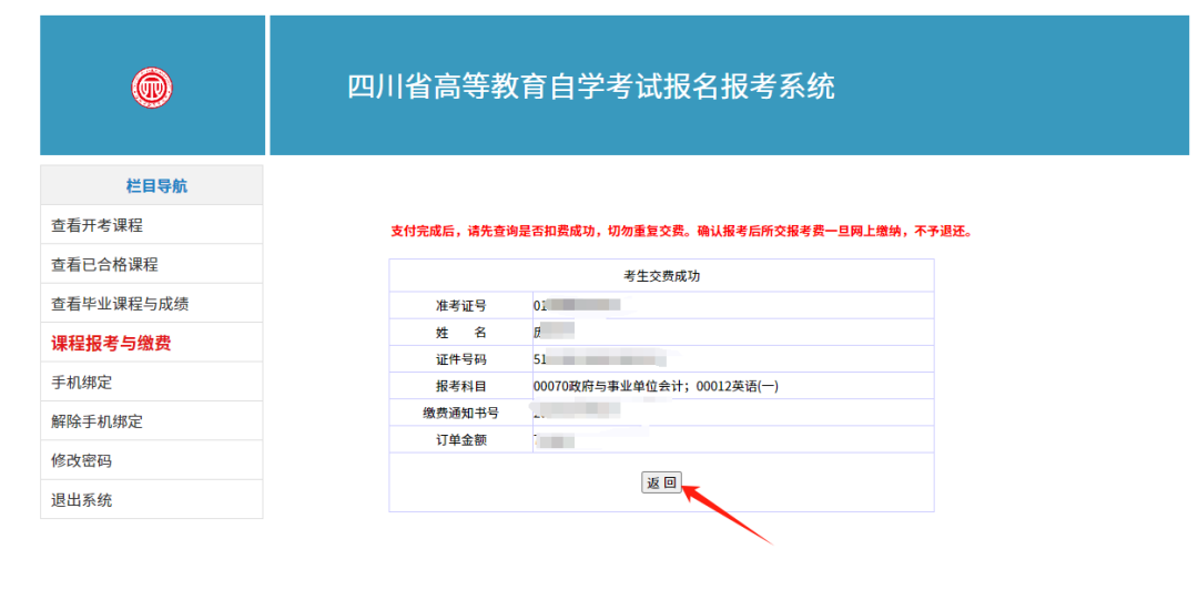 6.查看是否交费成功。检查无误后,点击“返回”按钮。