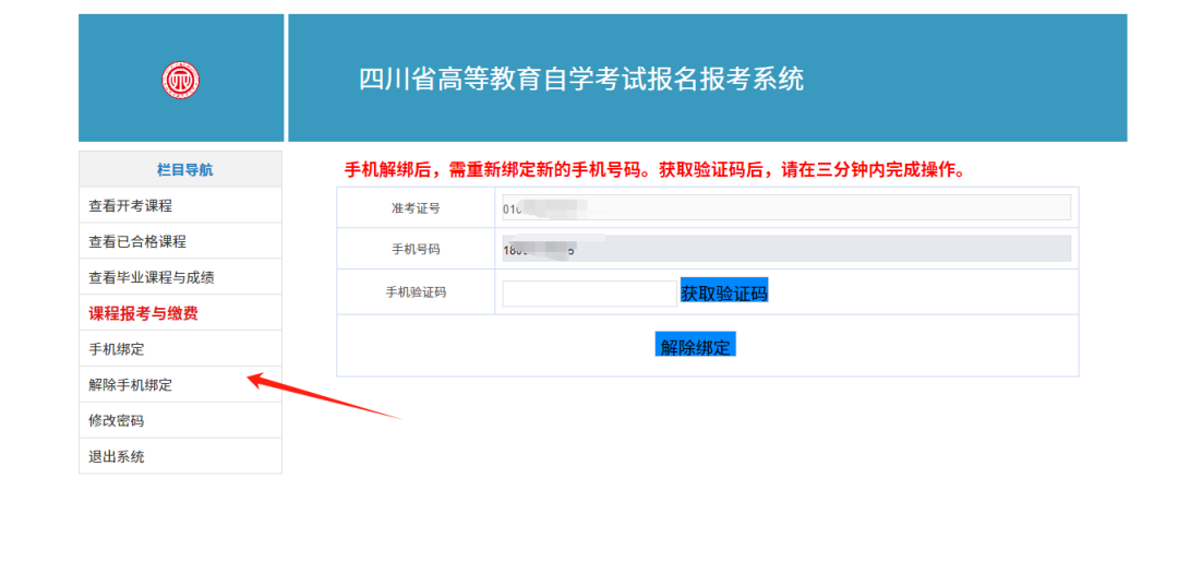 点击左侧菜单栏“解除手机绑定”可解绑手机。