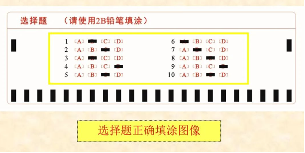 ▶如果某个选项被墨水等物质沾污,会影响计算机识别、评分,如下图所示: