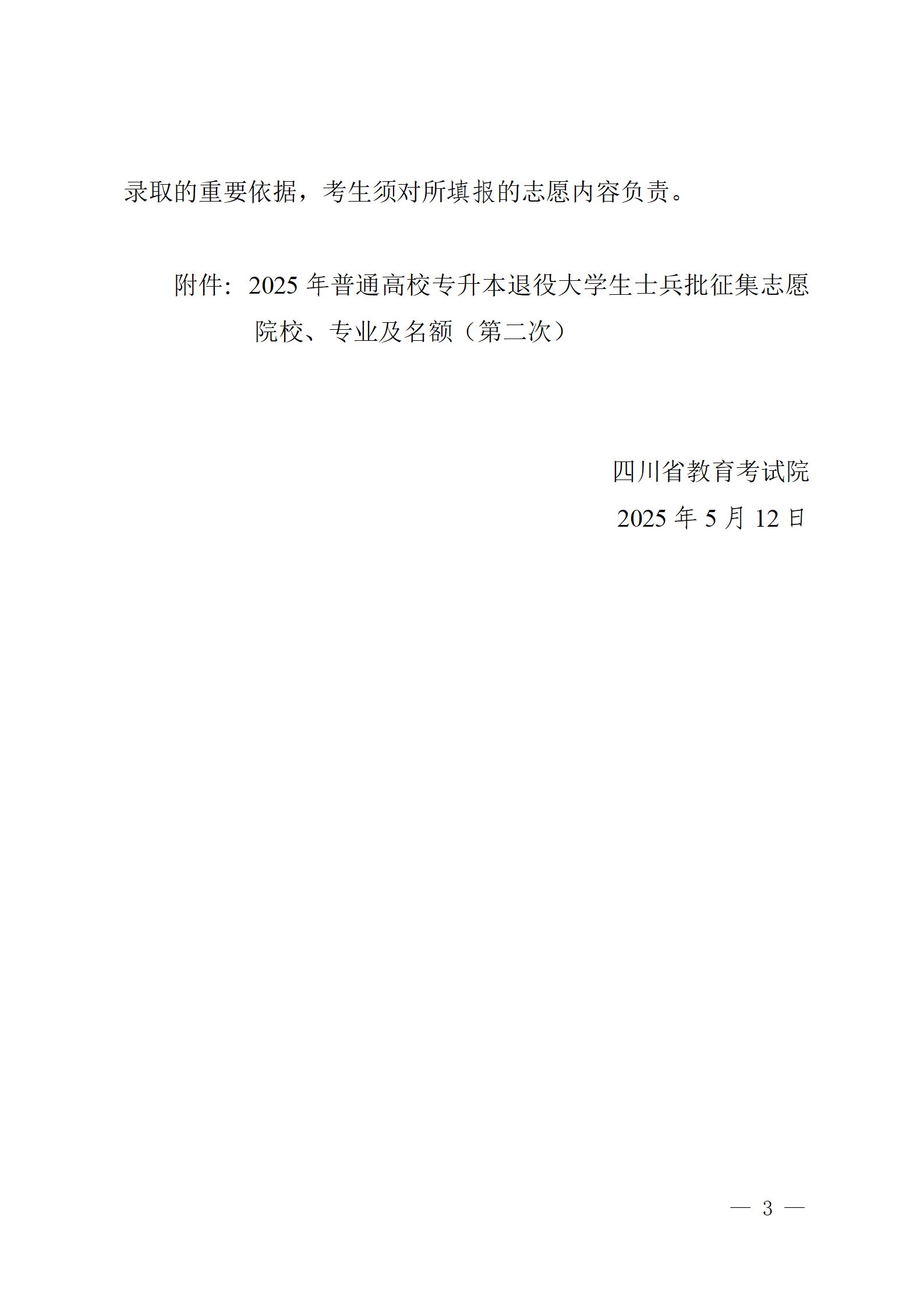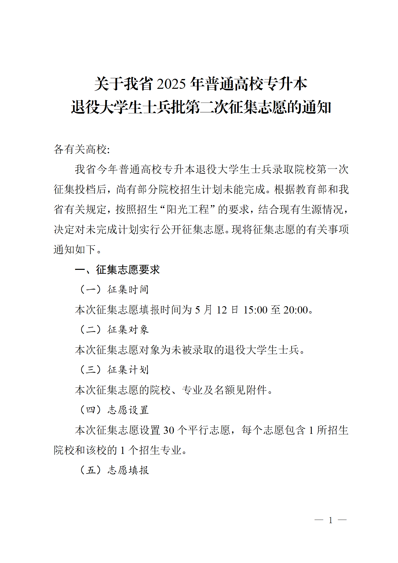 关于我省2025年普通高校专升本退役大学生士兵批第二次征集志愿的通知