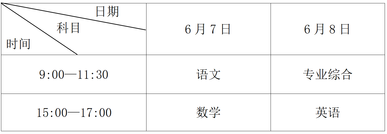 文化考试科目和专业综合科目考试时间为6月7日和8日。具体考试时间为: