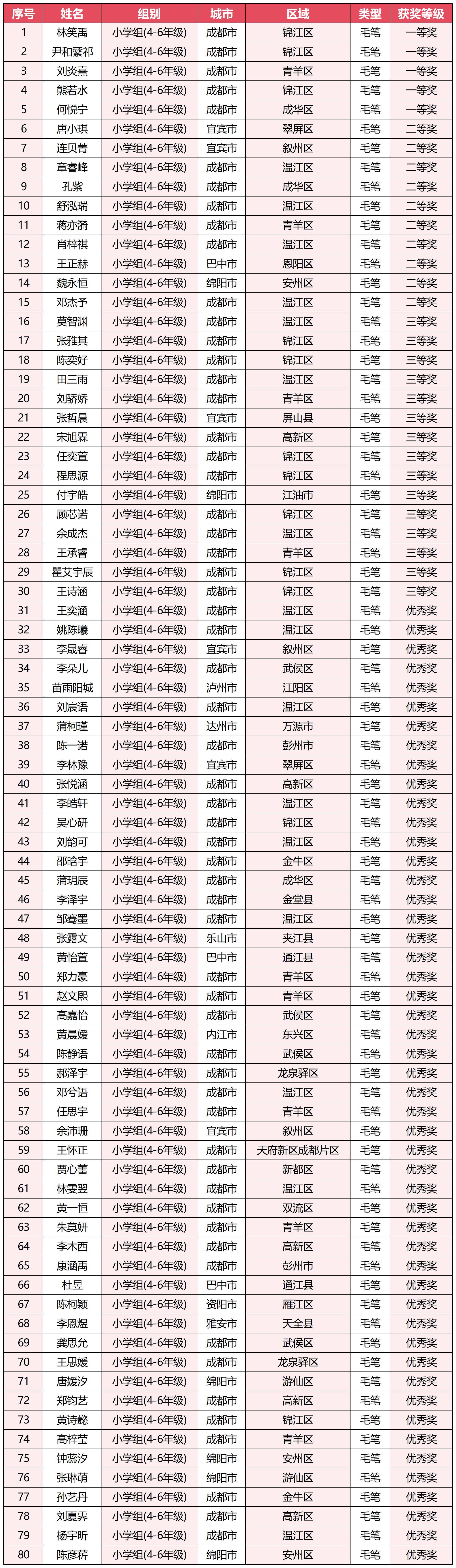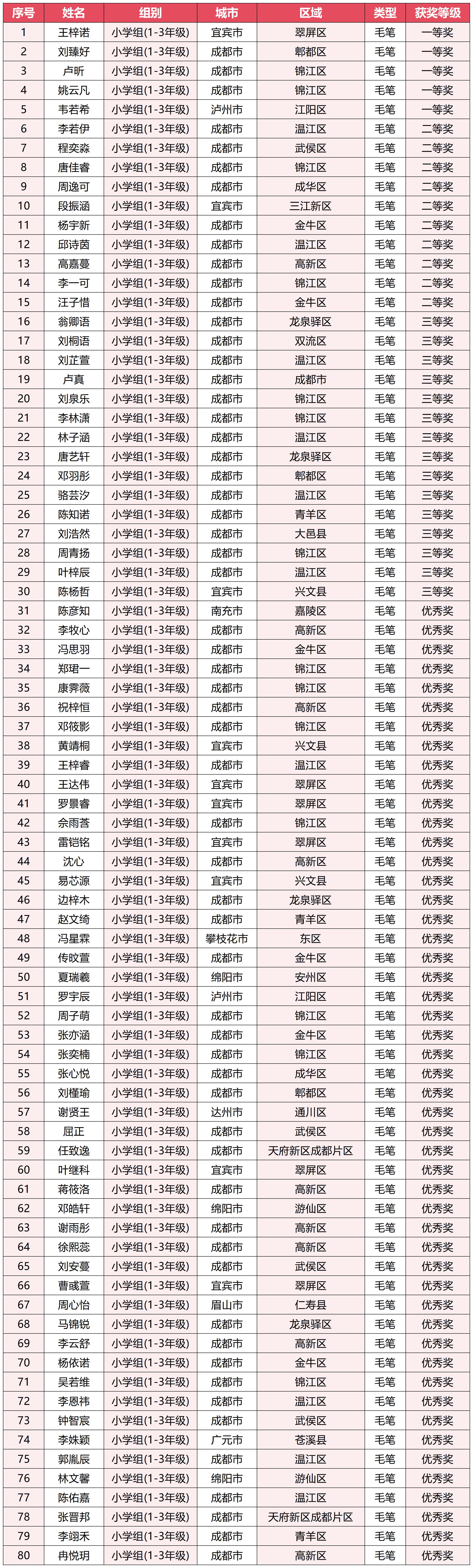 我省第二届中小学师生“书法人生·墨香校园”主题书法大展公益活动评选工作已圆满结束。经过评审专家组初评和复评,已评选出毛笔类和硬笔类的一、二、三等奖和优秀奖,现予以公示,公示期为7月14日至7月18日(共5个工作日)。公示期间,任何单位或个人如对获奖名单有异议,均可通过电话形式反映,举报电话:028-86654294