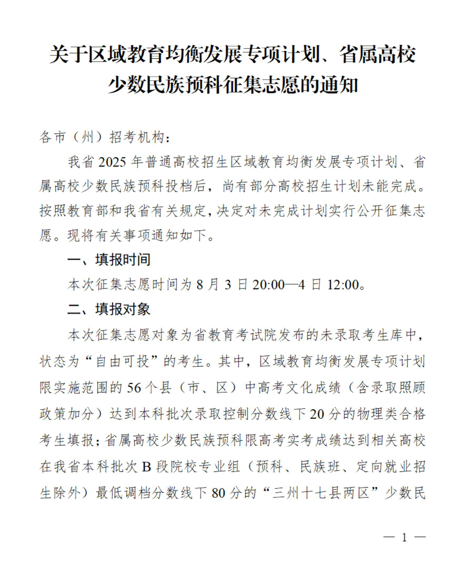 关于区域教育均衡发展专项计划、省属高校少数民族预科征集志愿的通知