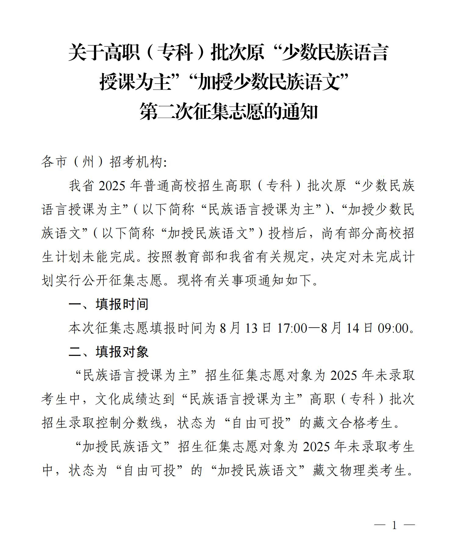 关于高职(专科)批次原“少数民族语言授课为主”“加授少数民族语文”第二次征集志愿的通知